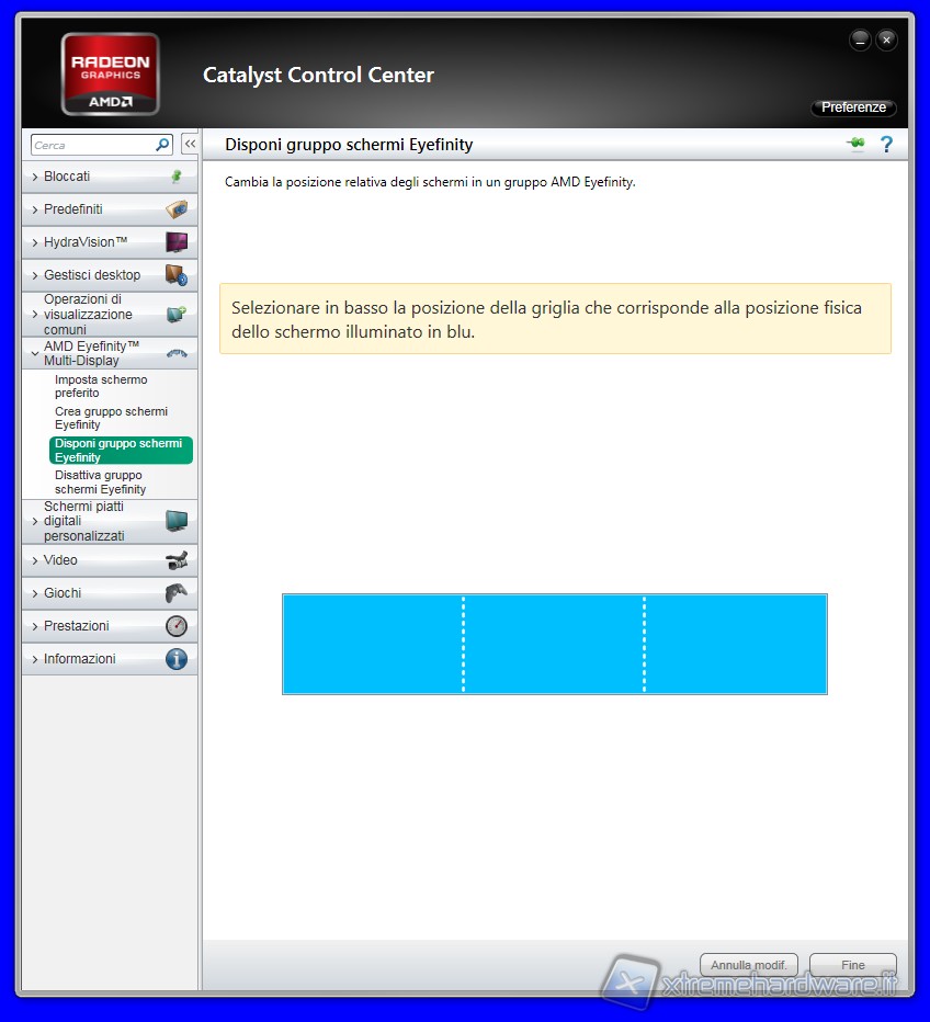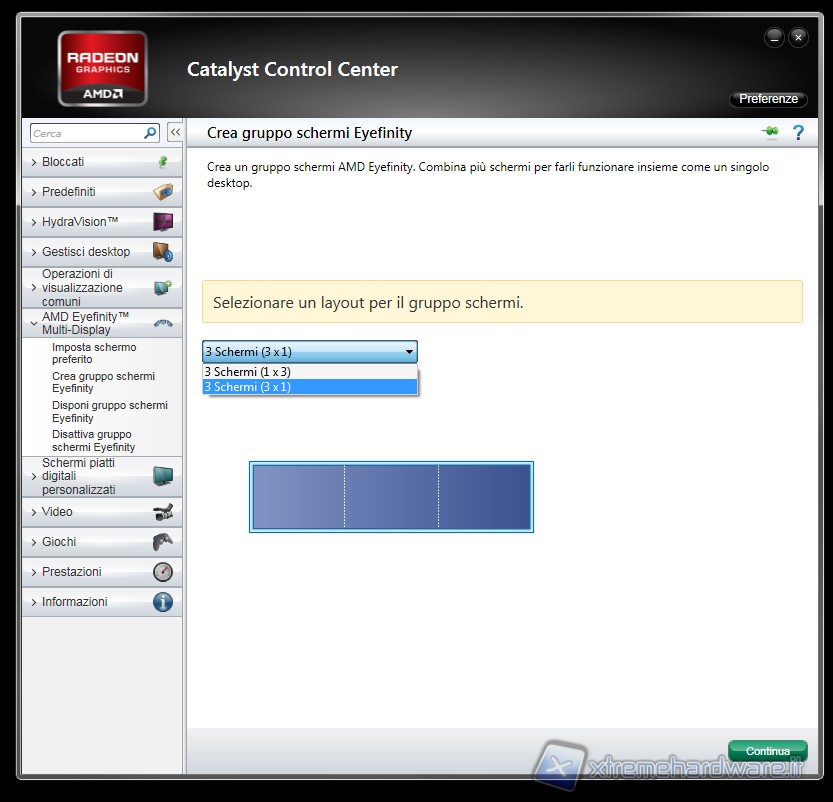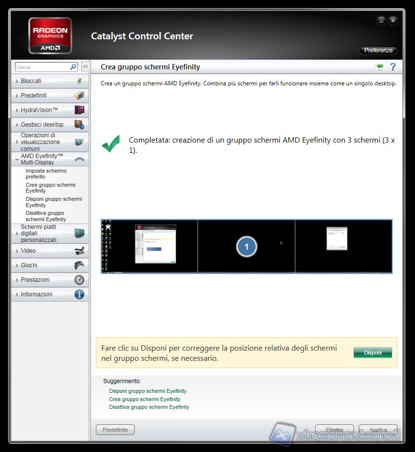 Apriamo il menù AMD Eyefinity Multi-Display e selezioniamo il sotto-menù Crea Gruppo Schermi Eyefinity che nel nostro caso riconosce immediatamente i tre display collegati e ci da la possibilità di impostare due configurazioni. La prima in modalità 3 schermi (3 x 1) in questo caso avremo una configurazione orizzontale con una risoluzione di ben 5760 x 1080.